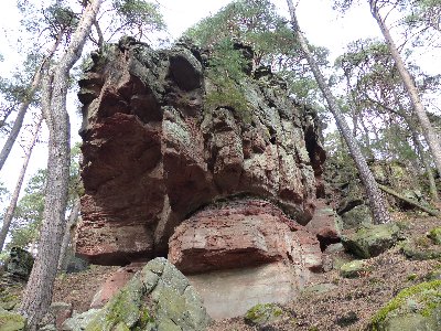 Vom kl.Parkplatz am Dinkelsbach - an der K32 4,7km östlich von Waldfischbach-Burgalben - ist der Fels gut zu sehen, soll aber (Stand Winter 2023) nicht von unten "direkt" angestiegen werden. Stattdessen folgt man dem ansteigenden Schottersträßchen rechterhand ca. 1km, bis spitzwinkelig rechts der Holzlandweg abzweigt. 200m südlich nimmt man den Brunnenwanderweg rechts, der anfangs leicht abfallend zurück und an den Felsen entlangführt.
