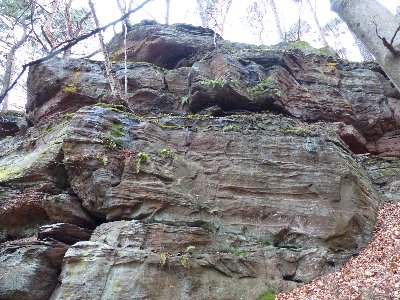| Ohne den "Dirketeinstieg" nur knapp 3 m Kletterei im Fels, die aber toll sind (Verschneidung mit einen Doppelriss in Faustbreite). Läßt sich nach der zweiten Birke mit dem ganzen Arsenal an Quackentechniken (Baumkaminen, Wurzel, Moosreibung und Stechgriff im Dreck) auch zum Gipfel (ergo Wald) aussteigen, dann endet es nicht einfach irgendwo auf einem Band. Ansonsten halt was für abgehärtete Dreckkreucher. |