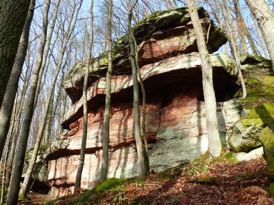 Östlich vom Ort von der Abfahrt zum Naturfreundehaus "Galgenberg" aus auf schmalem Pfad (kaum lesbare Schilder "F-Fels") ansteigend zum Fels.